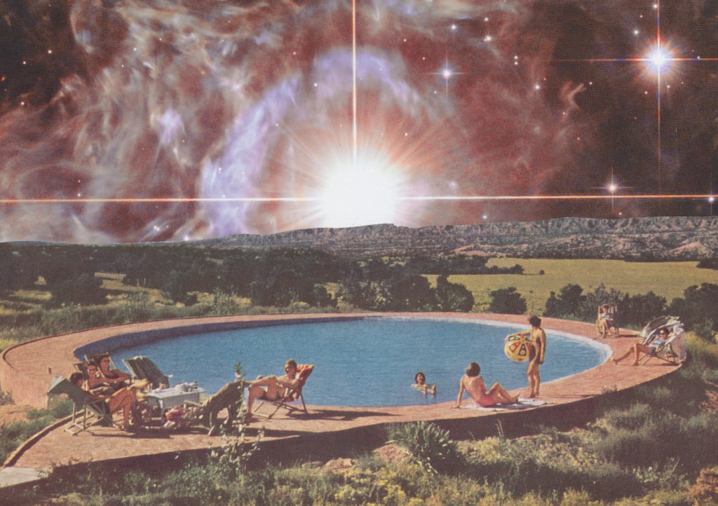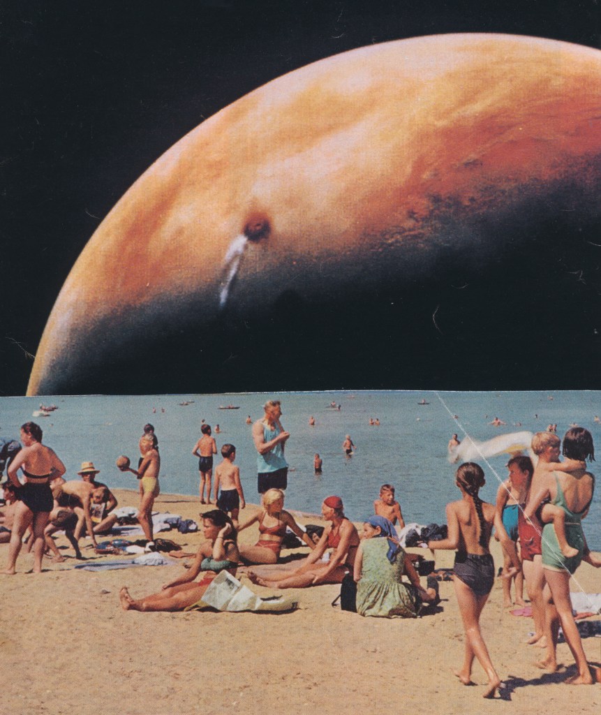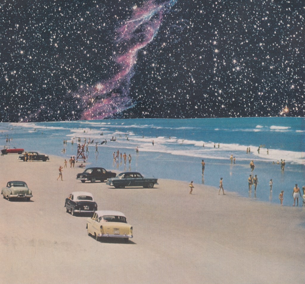 That said, if you’ve been following my art for awhile, you likely know that I love a good retro spacey beach scene, especially in the summertime. Because I dislike naming my collages, most of them are titled “Cosmic Summer,” or some variation thereof. I didn’t actually realize how many cosmic summers I had until just a few days ago–it’s a lot–so, I thought I’d share them all in one collection.