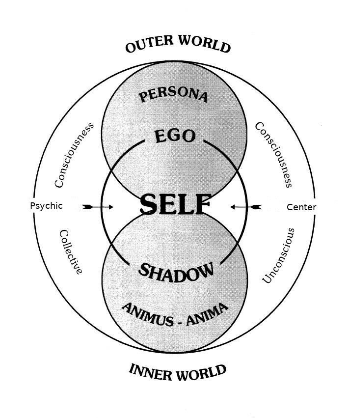 What’s noteworthy here: the archetype of the Self occupies the central point, or center of overlap, which is in keeping with his theory of integration. As more and more of the shadow becomes conscious, more and more of the lower circle becomes subsumed by the higher, and the size of the Self grows, such that the tension of opposites—here, exacted through the work of defense mechanisms which keep our repressions from becoming conscious—resolves. The Self then appears as a single, uninterrupted circle, which for Jung was an emblem of psychological wholeness.