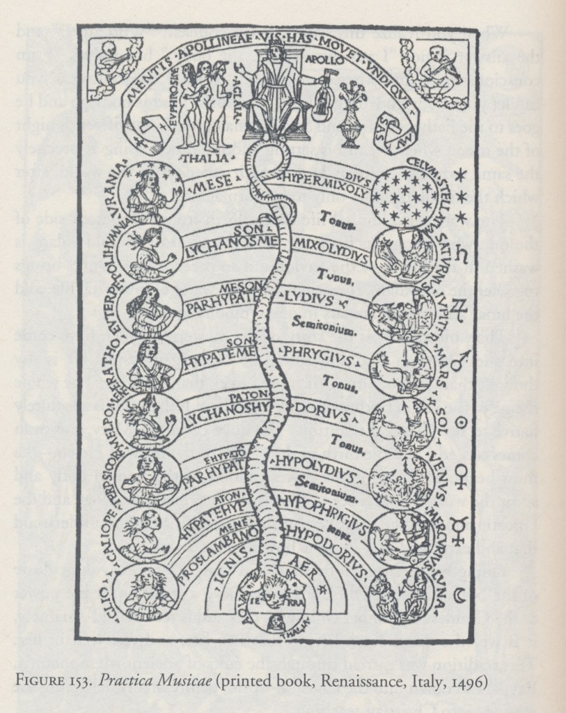 In mythology, the great goddess, or total goddess (“total” because she is multiple, often occupying many forms at once), is both eternal muse and architect for the “poetic realization of the self” (Cambpell’s words). Her most significant creative act, as mother of the spheres, is to take the naked energy of the eternal sphere and clothe it in the forms of the material world (hence the term, “self-fashioning”), a dynamic which is illustrated in the figure below from the Practica Musicae of Franchinus Gafuruis depicting stages in the illumination of the human soul.