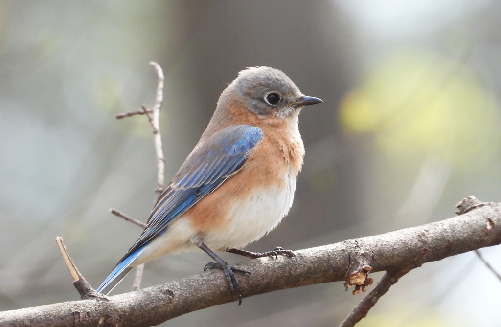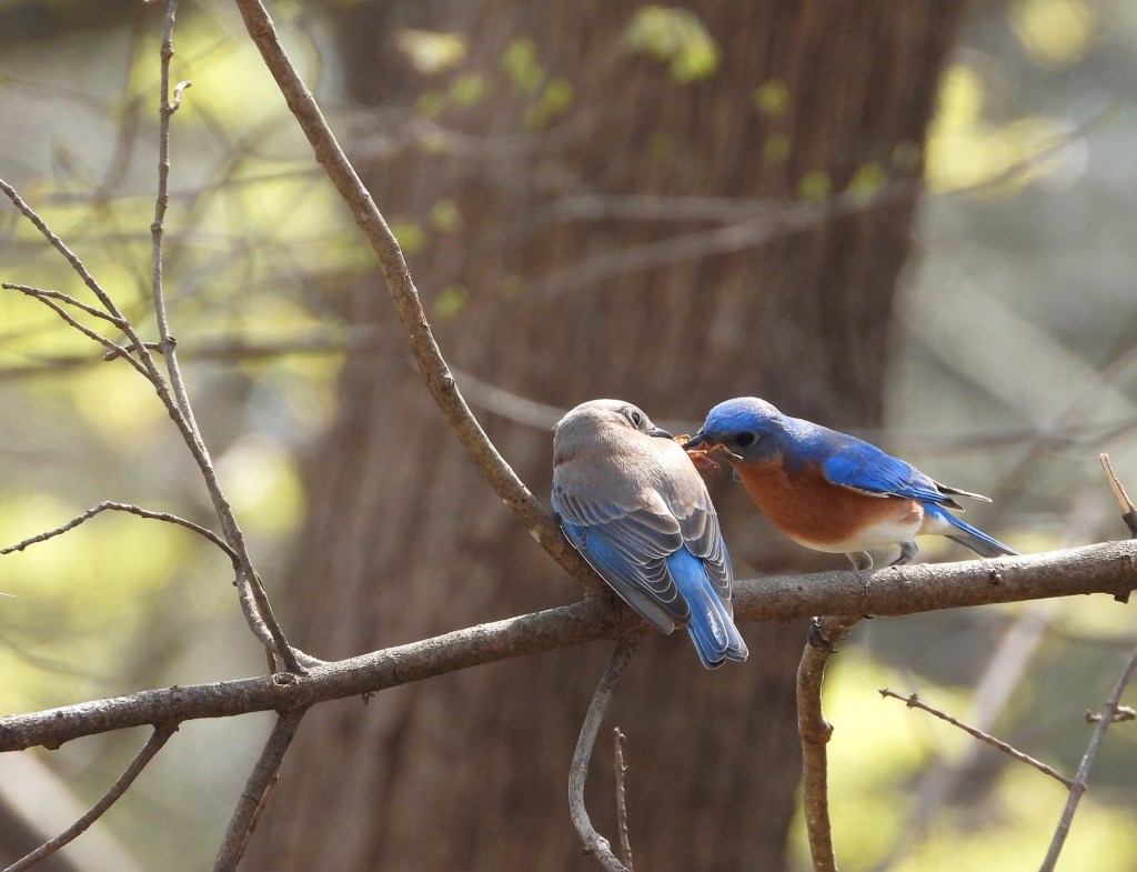 Eastern Bluebirds. I really wish the light in this photograph had been better. That said, I included it because it was a neat moment to capture: the male bluebird (right) is feeding his mate an insect. This behavior is called courtship feeding.