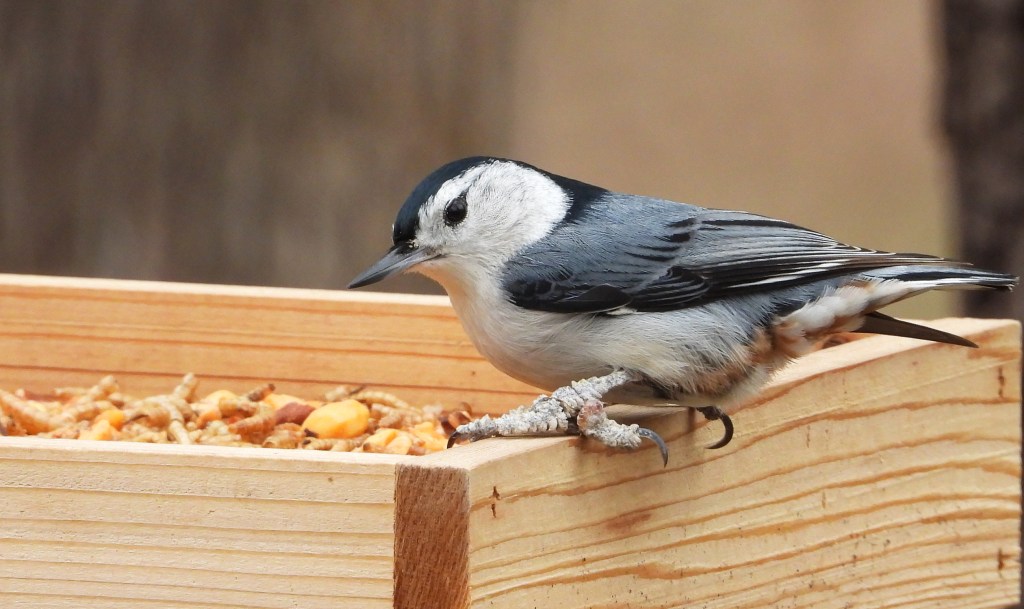White-breasted Nuthatch (male). Note how large his foot looks in this photograph. Nuthatches have large, strong feet for such little birds, which enable them to cling to tree bark and move easily in all directions.