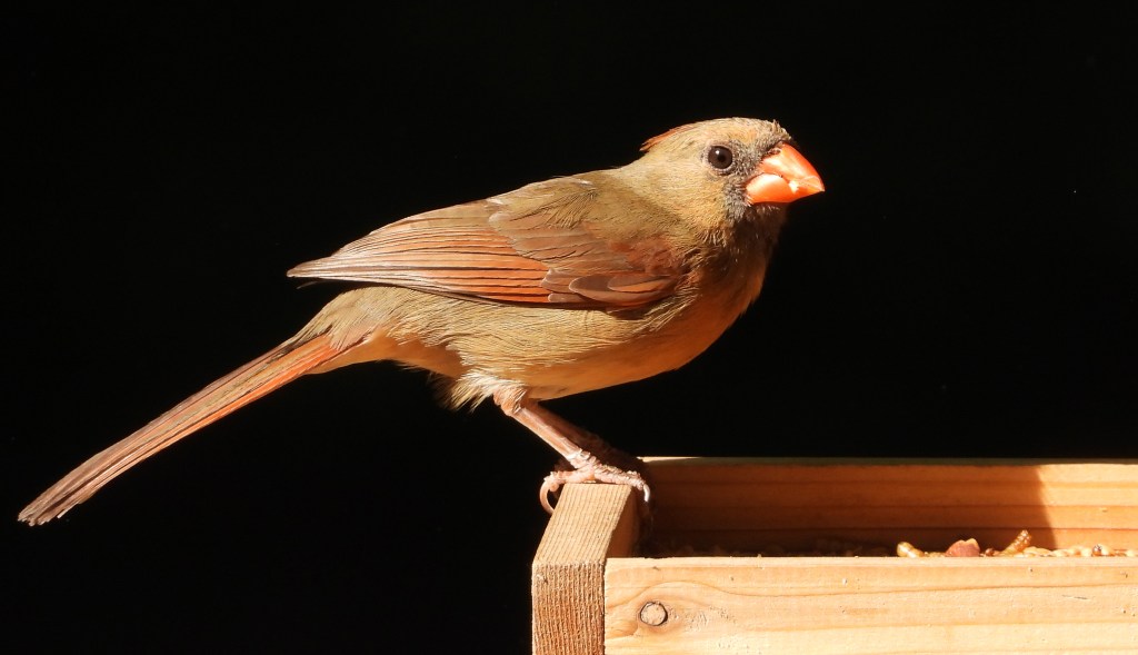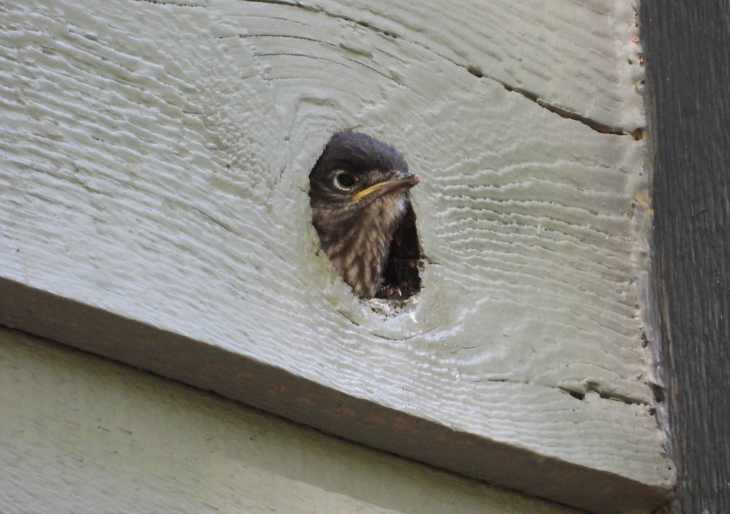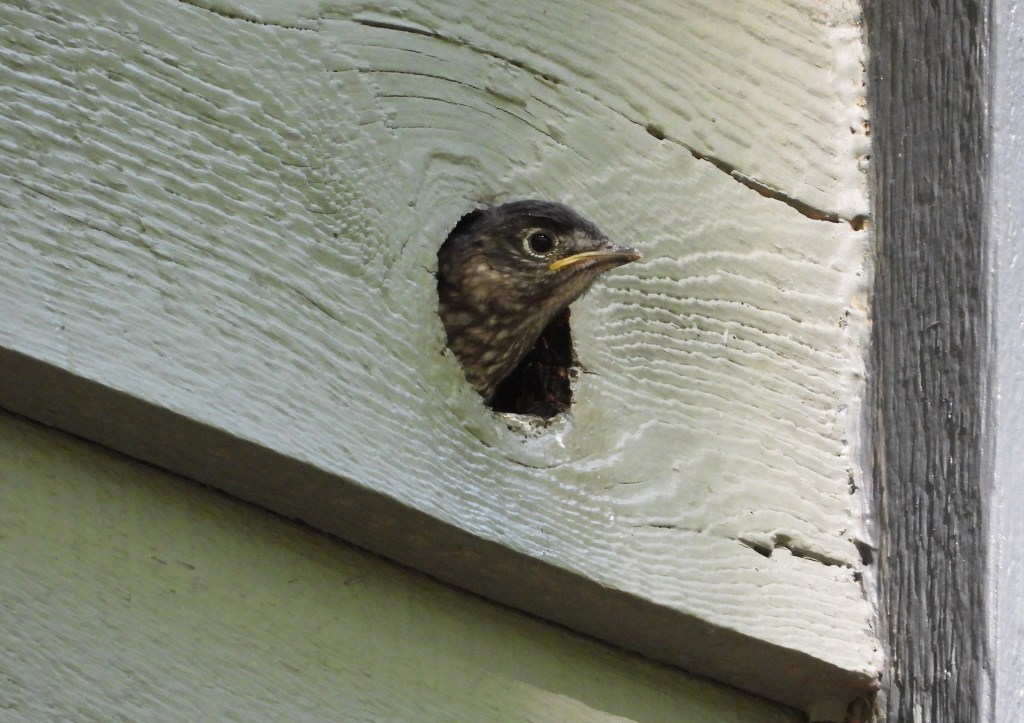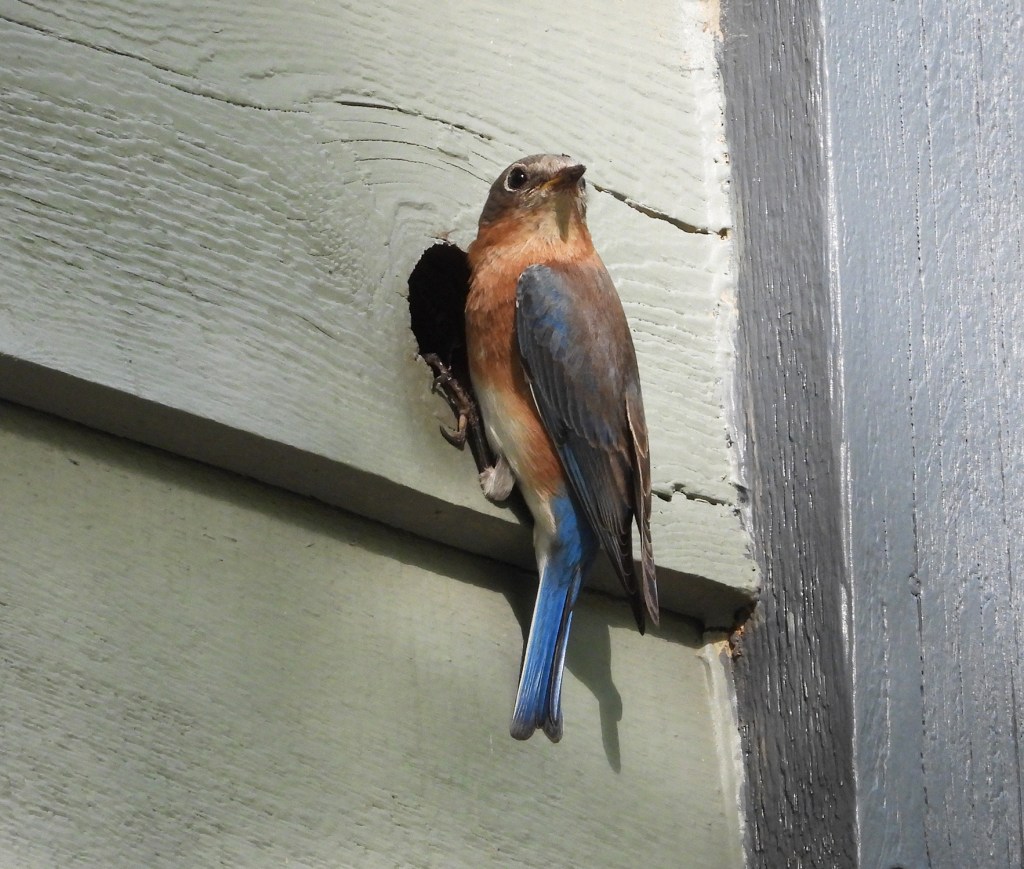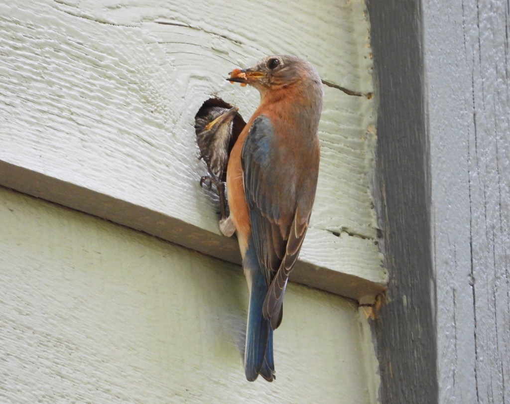 And, lastly, there is a pair of Eastern Bluebirds nesting in my house (yes, I said, in my house), and there are babies. One morning a few weeks ago, I was sitting in bed having coffee and thought I heard what sounded like chirping inside the walls…and that is, in fact, what I heard. There is a small woodpecker hole in the siding next to my bedroom window, and a pair of bluebirds has decided to nest in there.