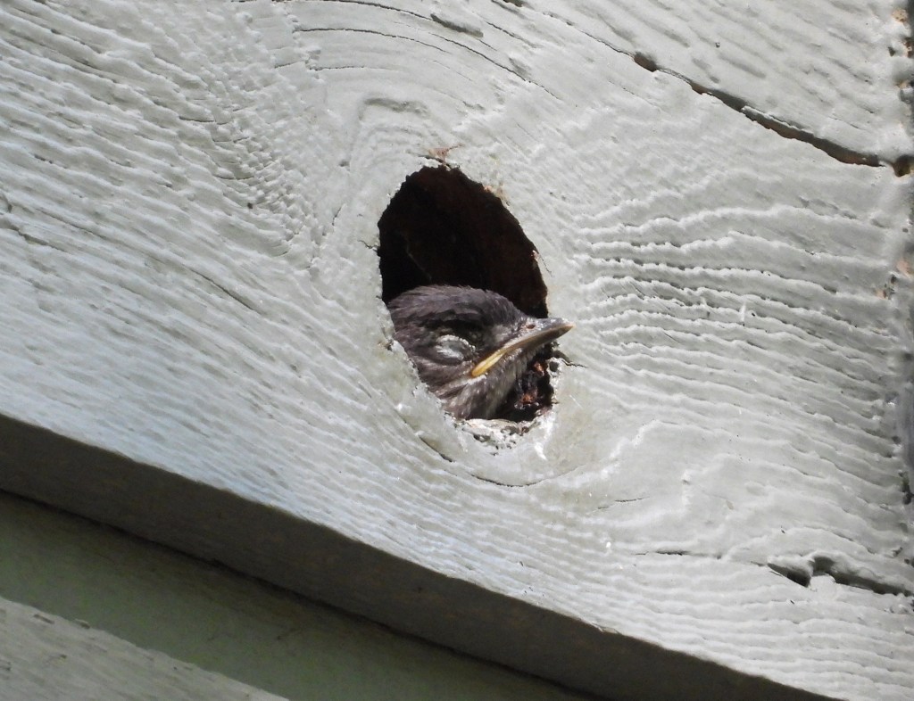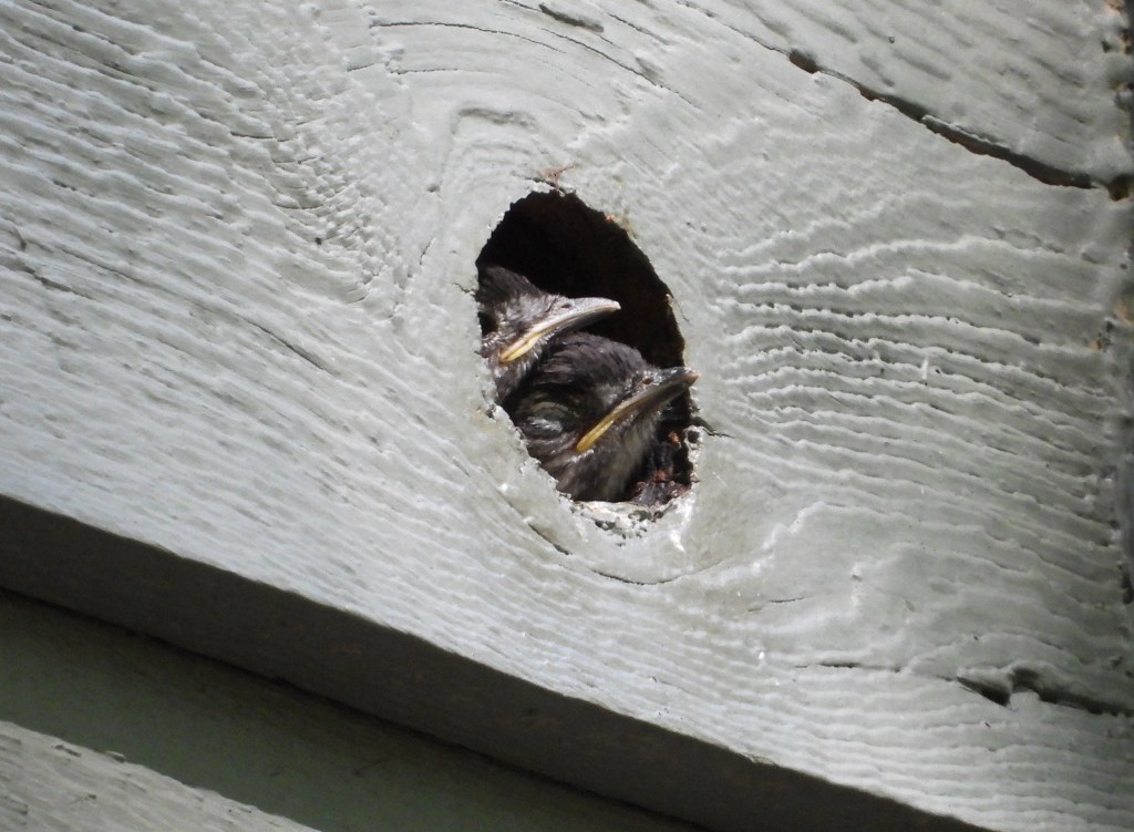 This is, of course, not the most ideal location for a nest from my perspective, but there’s nothing to be done about it now. I’ve been listening to the babies chirp for the past few weeks, and this afternoon, I saw two little faces peaking out of the woodpecker hole.